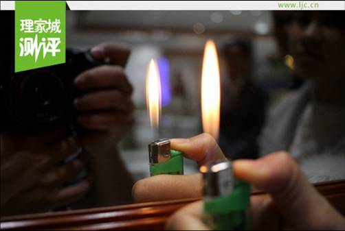 美加華衛(wèi)浴浴室柜環(huán)保防水防銹銀鏡。小編現(xiàn)場(chǎng)用打火機(jī)測(cè)試鏡柜成像清晰度,將火焰靠近浴室鏡,鏡中火焰清晰,真實(shí)不扭曲。